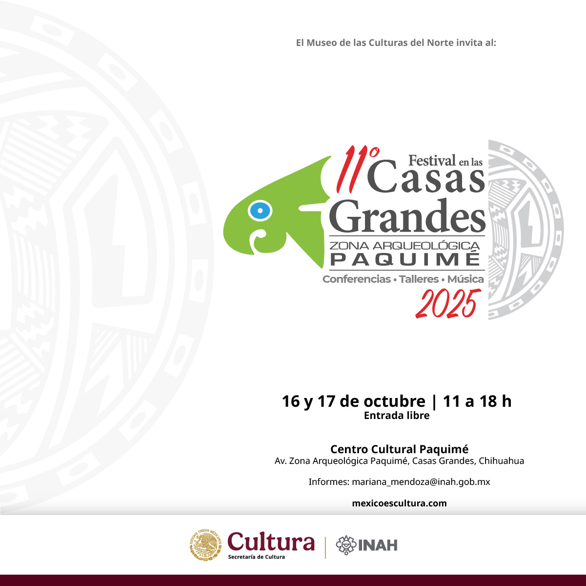 El Instituto Nacional de Antropología e Historia (INAH) en Chihuahua, a través del Museo de las Culturas del Norte (MCN) se alistan para celebrar el XI Festival en las Casas Grandes, para lo cual se ha diseñado un amplio programa de actividades totalmente gratuitas a desarrollarse el 16 y 17 de octubre de 2025...