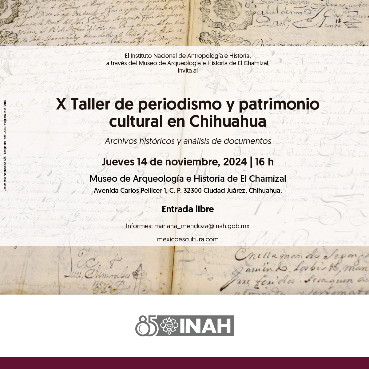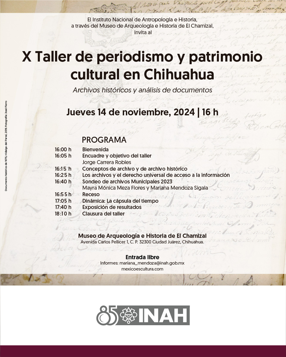 El Centro INAH Chihuahua invita a comunicadores, periodistas, profesionales de la difusión cultural, estudiantes y público general a su X Taller de Periodismo y Patrimonio Cultural Chihuahuense con el tema “Archivos históricos y análisis de documentos” a realizarse el próximo jueves 14 de noviembre a las 16:00 horas en el Museo de Arqueología e Historia de El Chamizal (avenida Carlos Pellicer 1, Ciudad Juárez, México.
