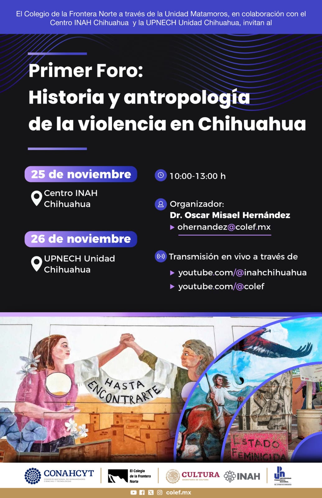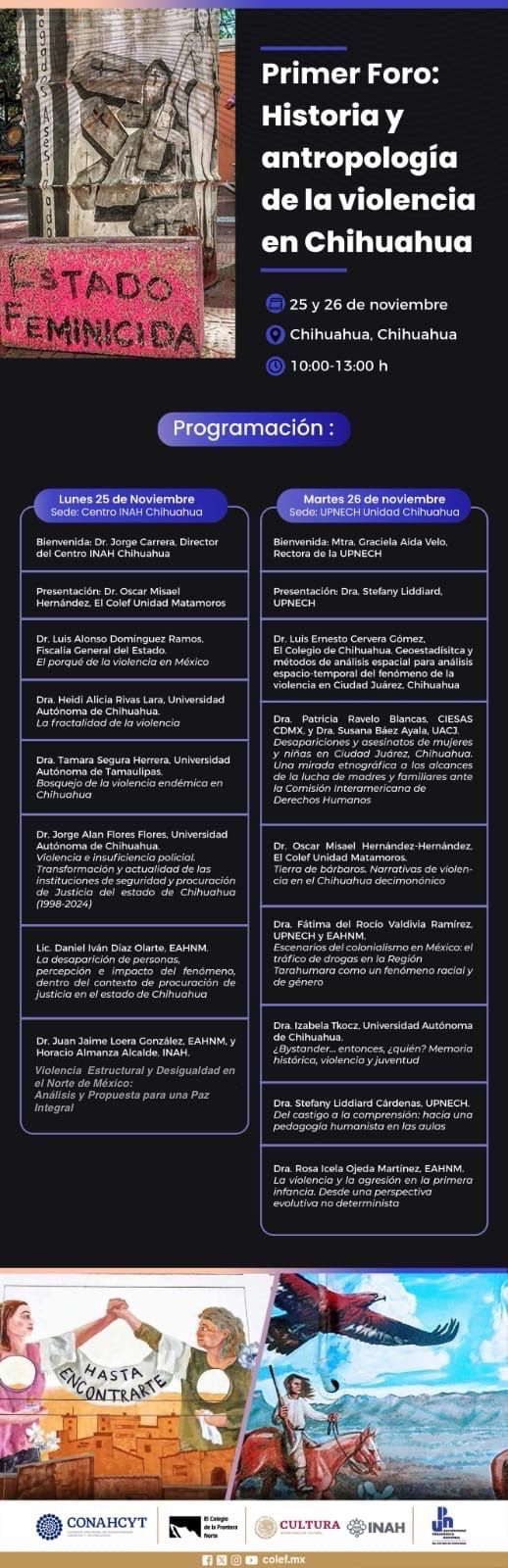El Centro INAH Chihuahua en colaboración con El Colegio de la Frontera Norte (Colef Matamoros), invitan al Primer Foro: historia y antropología de la violencia en Chihuahua, a celebrarse los días 25 y 26 de noviembre del año en curso, en la ciudad de Chihuahua. En dicho foro, diferentes instituciones expondrán, a través de conferencias, estudios históricos y antropológicos sobre la violencia en Chihuahua. Específicamente analizarán los enfoques teóricos y metodológicos utilizados, así como los traslapes de la violencia en aspectos como la raza, el género, la edad u otras. Desde hace varios años, el Colegio de la Frontera Norte ha impulsado una línea de investigación sobre la violencia y los derechos humanos, con el propósito de que se den a conocer los aportes que, desde la historia y la antropología, entre otras disciplinas, se han hecho sobre este fenómeno en regiones específicas del norte de México.